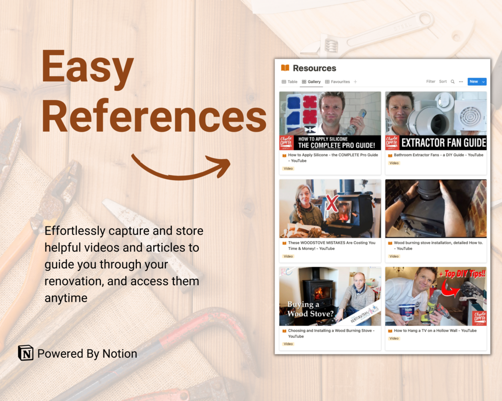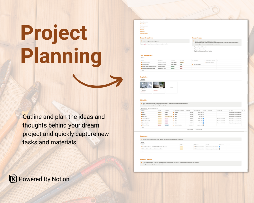 Whether you're a seasoned pro or a first-time renovator, our dashboard has everything you need to make your project a success. Say goodbye to messy spreadsheets and cluttered notes, and hello to a streamlined, organized approach to home renovation with Notion.