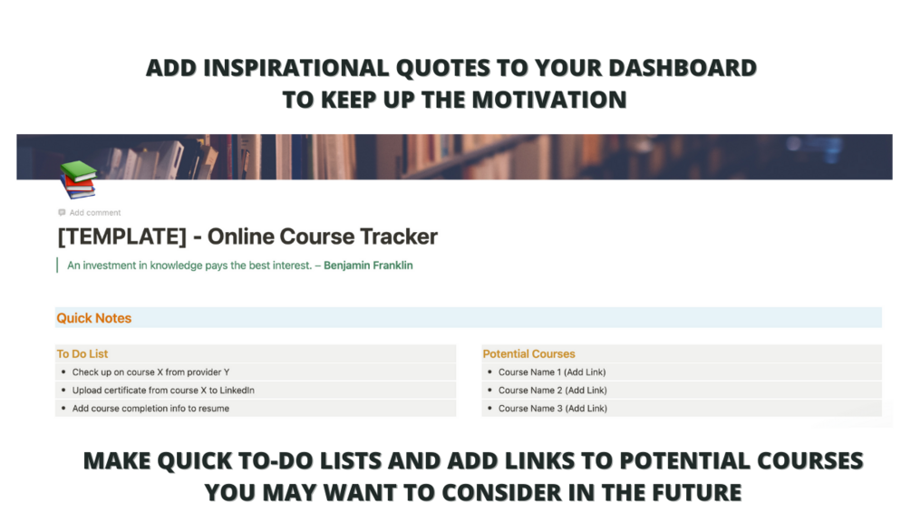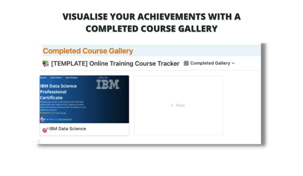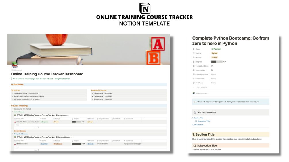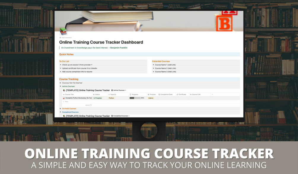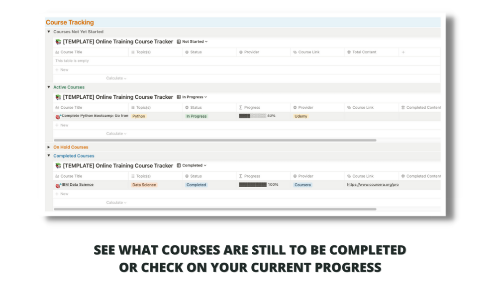 Easily keep track of your online training courses in one place using this dashboard inside of Notion. You can gain an overview of which courses are active, on hold, and even view a gallery of your completed courses to help you visualise your achievements.